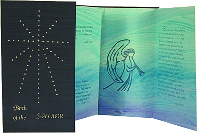 Birth of the Savior is a double gatefold book with Shantung cloth covers. The text is letterpress printed onto paste paper by the artist. The illustrations are hand carved linoleum blocks. The text connects several Old Testament prophesies of the birth of the Savior with the account of the birth in the Gospel of Luke. 2006. Edition of 50, $45.