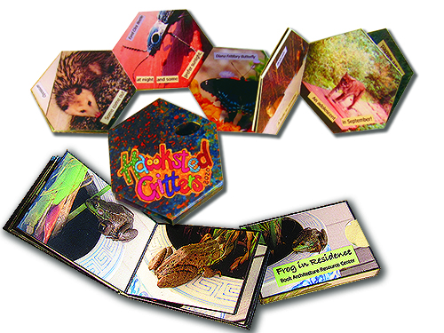 Take a palm-size wildlife safari through the artist's nature preserve in upstate New York. Beasts, bugs, and birds parade across 26 hexagon-shaped rotating pages that have been laser cut, scored and folded from a single sheet of paper. Hawksted Critters is 3" x 2.75", custom slipcase, open edition, $60.