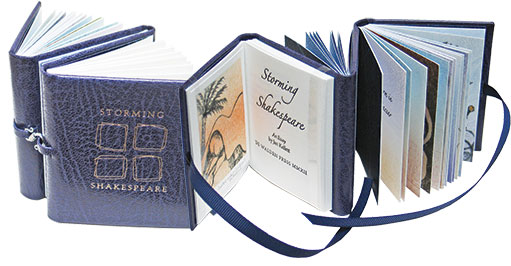 Triple dos à dos is the name I've given to the binding of this miniature book, it has four book boards in all, with three text blocks. Letterpress printed on cotton and handmade Japanese gampi papers, the essay explores Shakespeare's use of storms in Julius Caesar, King Lear and The Tempest. Parts 2 and 3 contain quotations from the plays, with original monotype and drypoint illustrations. Leather bound, in slip case, fastened with ribbons on one side and sterling silver hook and loops, varied edition of 20, signed and numbered. Size approx. 2.8"x 2.6" x 1", CA$ 895.00 (about US$ 881.00, March '13).