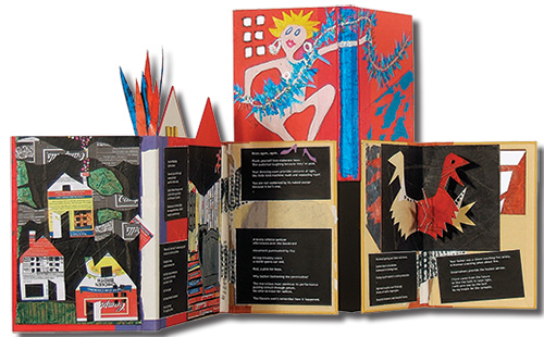 Warhol et al, an accordion-fold painter’s book with pop-ups, collaged papers and acrylic on multilayered and cut papers and board, 5 pages, 12.5” x 16.5” x 1.7” expanding to approximately 36”.