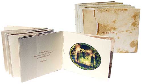 In this chronicle of luminous transformations, a ring of mushrooms at the edge of the woods sets a stage for the unexpected. Papers chosen for this book evoke mushrooms, dried leaves and earth: Mexican Yucatan Hunn paper for the cover and Nideggen paper with Chartham translucent vellum interleaving for the text. Signatures are sewn into folds of a layered accordion structure with linen thread. Text by the artist. Photos by R. Renbeck embellished by the artist. Printed by inkjet with archival inks, 5.25” x 4”. Edition of 25, $100.