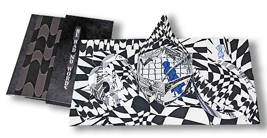 Elderly people, like my father, who suffer from Dementia become estranged from their families. He Had No Words is a visual expression of his distorted thinking. Words and letters are jumbled as seen in the coil that is interwoven in the pop-up landscape. The central structure is his apartment with the blue shadow on the floor representing a lost love. The upper right flap opens to a figure withdrawn from his home and his life. The book size [closed] is 10’’ x 9”, made from digital premium paper and Lama Li paper. Edition of 20. $300.