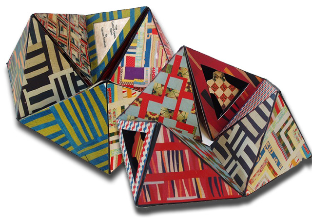 Remarkable works of art, from a tradition that dates back four generations, are made by women who live in a rural African, American Alabama community. The goal was to improvise with established designs to create a unique composition. Materials such as old clothes, cornmeal sacks, denim jeans and fabrics that fit the color palette were used. This book honors the unnamed women who made these unusual and stunning quilts. The Quilts of Gee’s Bend, vol. 2 is a flexagon, H- 3.5" x W-8.5" x D-8.5". inkjet printed on Epson paper. Edition 25, $250.