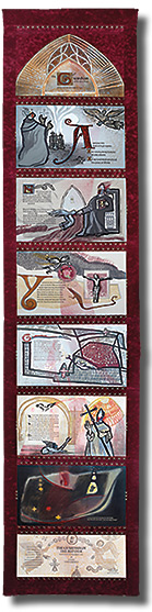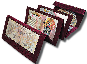 Letterpress printed on Magnani Pescia paper with woodcut, monoprint, chine-colle, stencil and ink-jet printing. Pages have been marked with graphite, acrylic, colored pencil and gold foil. Limited edition of 8 books, bound in Laval book cloth using metallic thread and presented in a felted wool case. Closed accordion structure measures: 27.25" x 17". When opened: 128" long. Please contact artist for price.