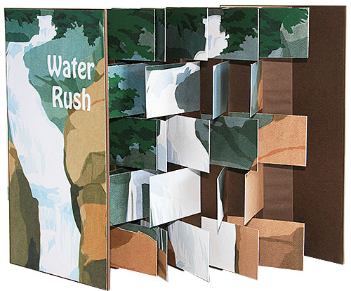 Water Rush is pushing the flag book structure-- times 2, making it a double or reversible book, both sides attached to a single spine. It has two covers and two parts of a screen printed image. The stylized image of a mountain waterfall deep in the forest is a 15 color serigraphy by printmaker Jill Timm, done years ago, before the book arts passion took her, now the print has been converted into a book. Includes a descriptive colophon. Size is 4.75" x 8.5". Edition of 24. $345.