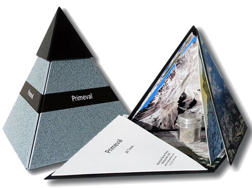 Primeval could be showcasing the earth millions of years ago, but is actually showing the current landscape. Features a brief description of what happened in the massive 1980 eruption of Mt. St. Helens and overhead photos of the newly reformed landscape, in the aftermath of an earth changing event. Primeval unfolds to 4 panels, 3 foldouts, lots of photos, text about the eruption of Mt. St. Helens, a colophon, and a sampling of real ash from the volcano, bound with wire edge binding. The book is 5.5" x 6" x 6". Comes with a tetrahedron case. Edition of 20. $425.