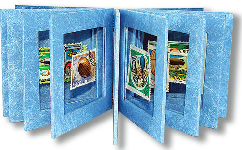 Hot air balloons, blimps, dirigibles, and airships are all lighter than air as explained in the illustrated 12 pages at the front of this book. But the magic of Lighter Than Air is the following pages of real postage stamps depicting historic events and illustrate world wide air ships. The stamps float in air of the page frame suspended by invisible strips of acetate. The text block is digitally printed. Lighter Than Air is 4.25" x 4.25", with 18 actual postage stamps. The board pages are covered with stained Tyvek and bound by interwoven ribbon. Lighter Than Air comes with matching clamshell case. Edition of 7, $395.